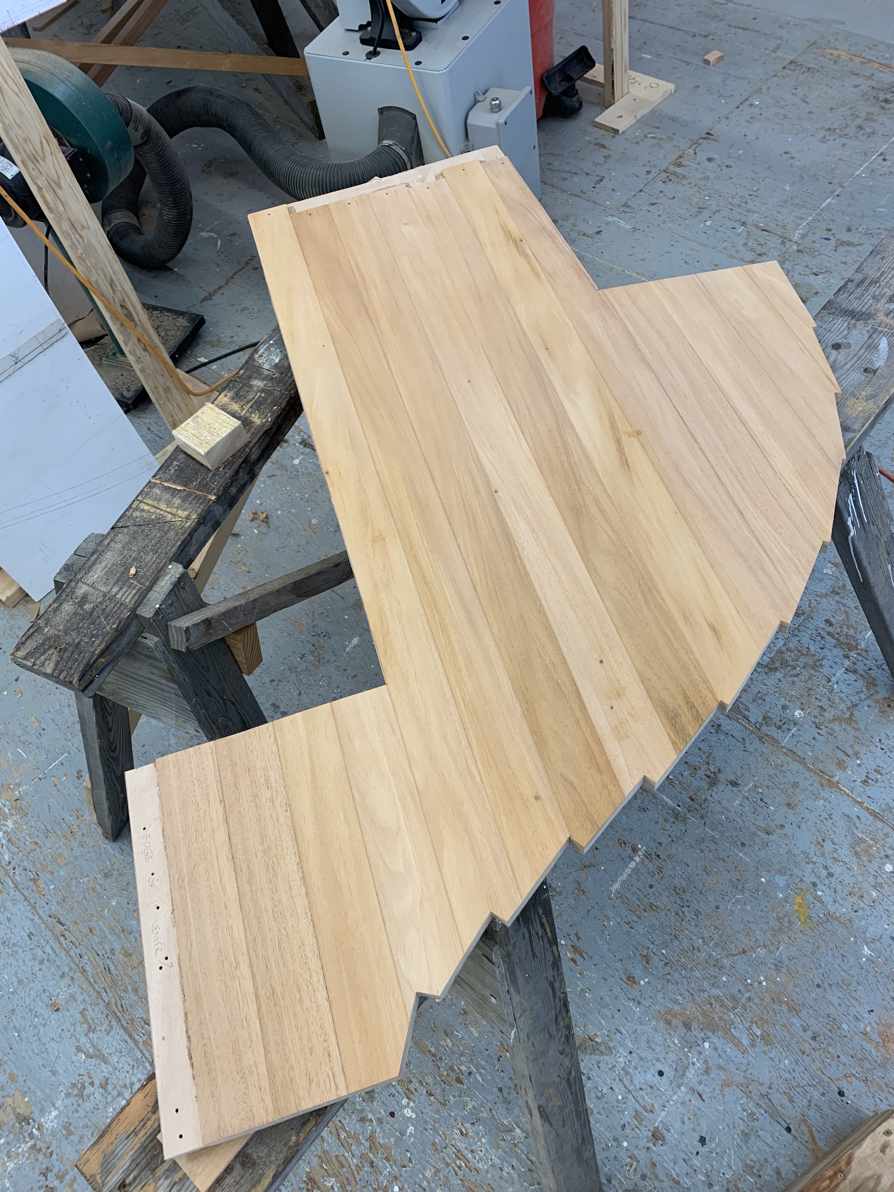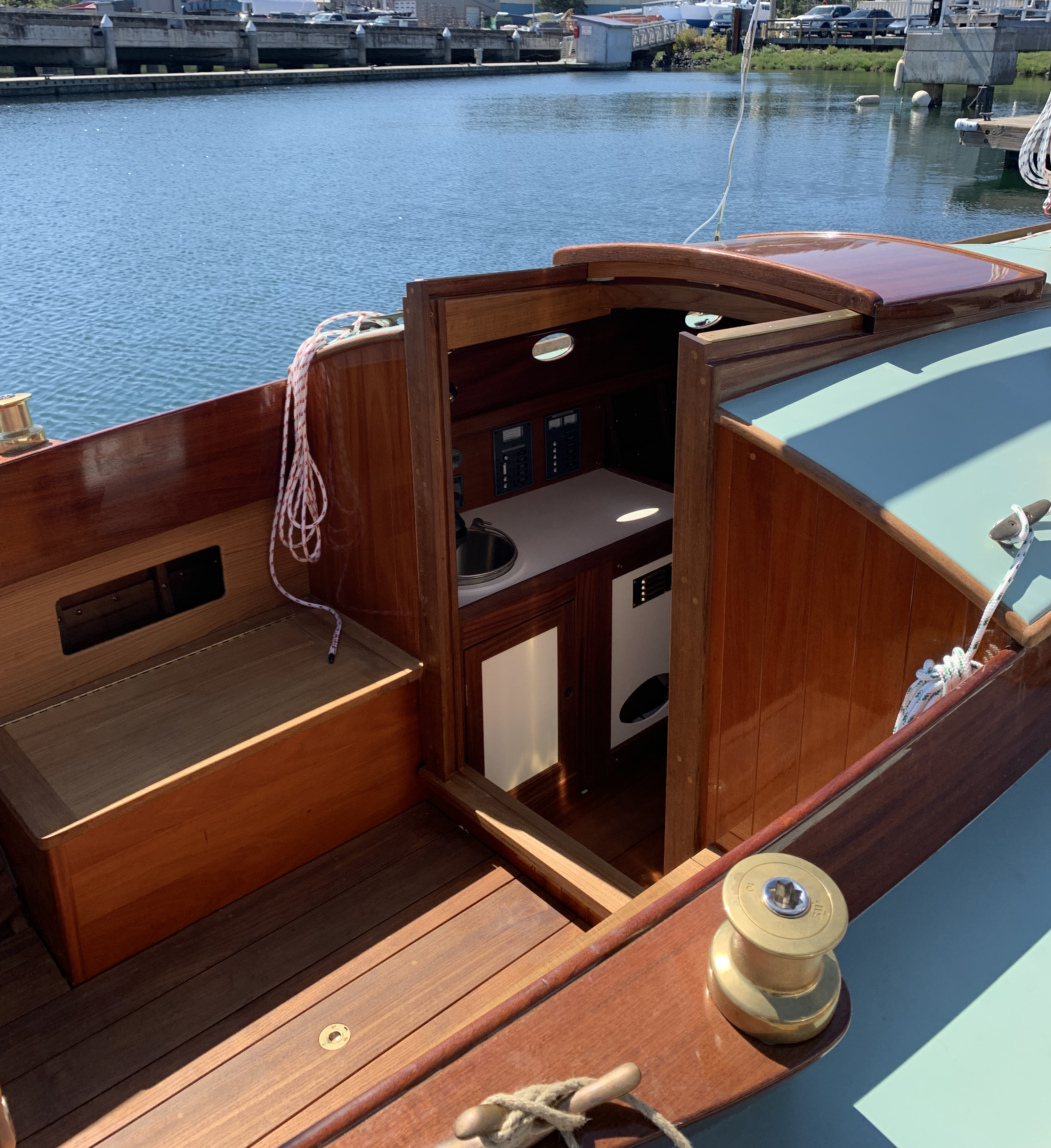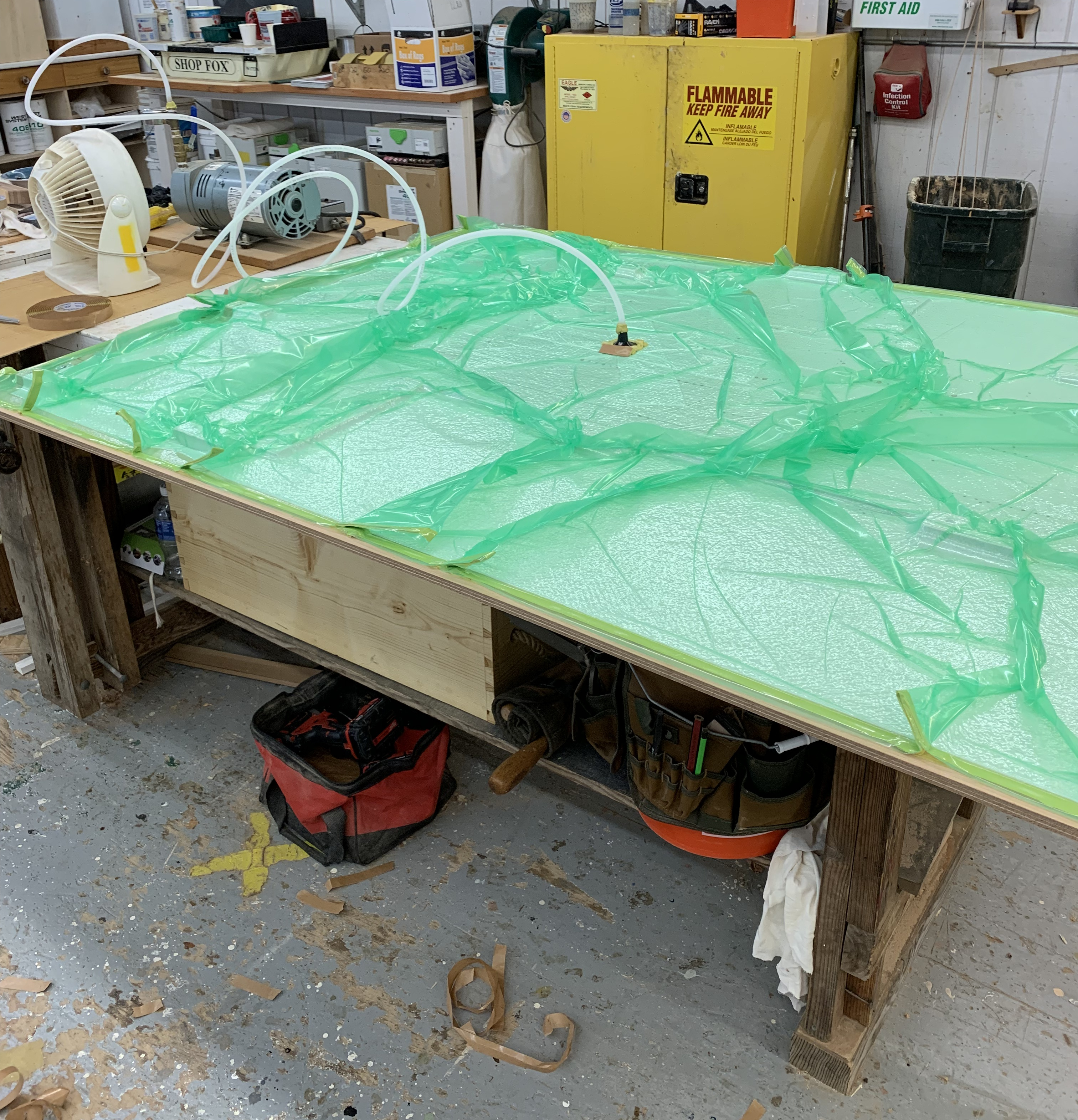 During my boat building course I patterned for and made two faux tongue-and-groove bulkheads for the Folkboat. I used plywood, Honduran mahogany, and the vacuum bag technique. I milled ¼” x 2 ¾” mahogany veneers and laid them out on both sides of the sheets of plywood in their rough finished shape. I laminated the veneers to the plywood substrate using epoxy and a vacuum bag. I repeated this process three more times to create two, double-sided veneered bulkheads. Next I set up a router jig to route shallow v-grooves along the veneer seams to create the tongue-and-groove appearance. Lastly I transferred the patterns to each of the two veneered plywood pieces and cut out their final shape using the jigsaw and bandsaw.