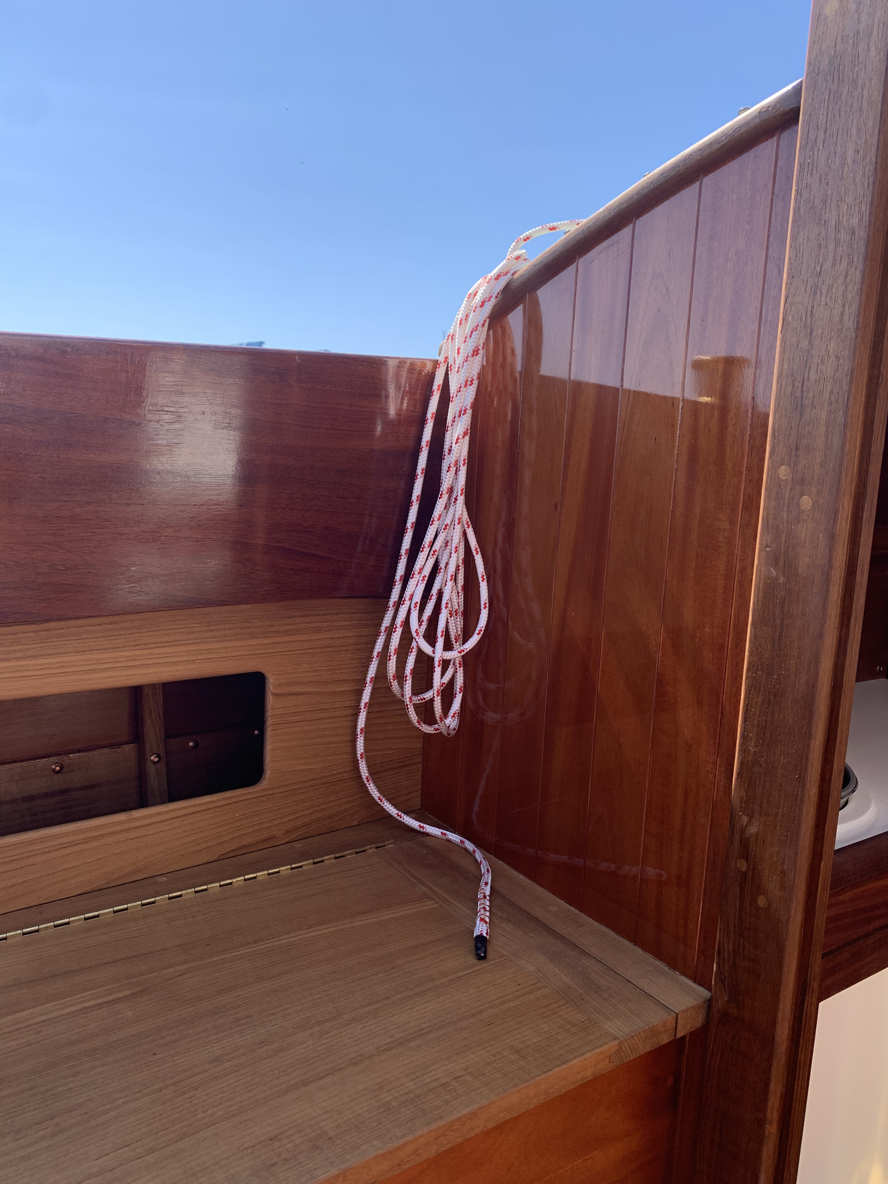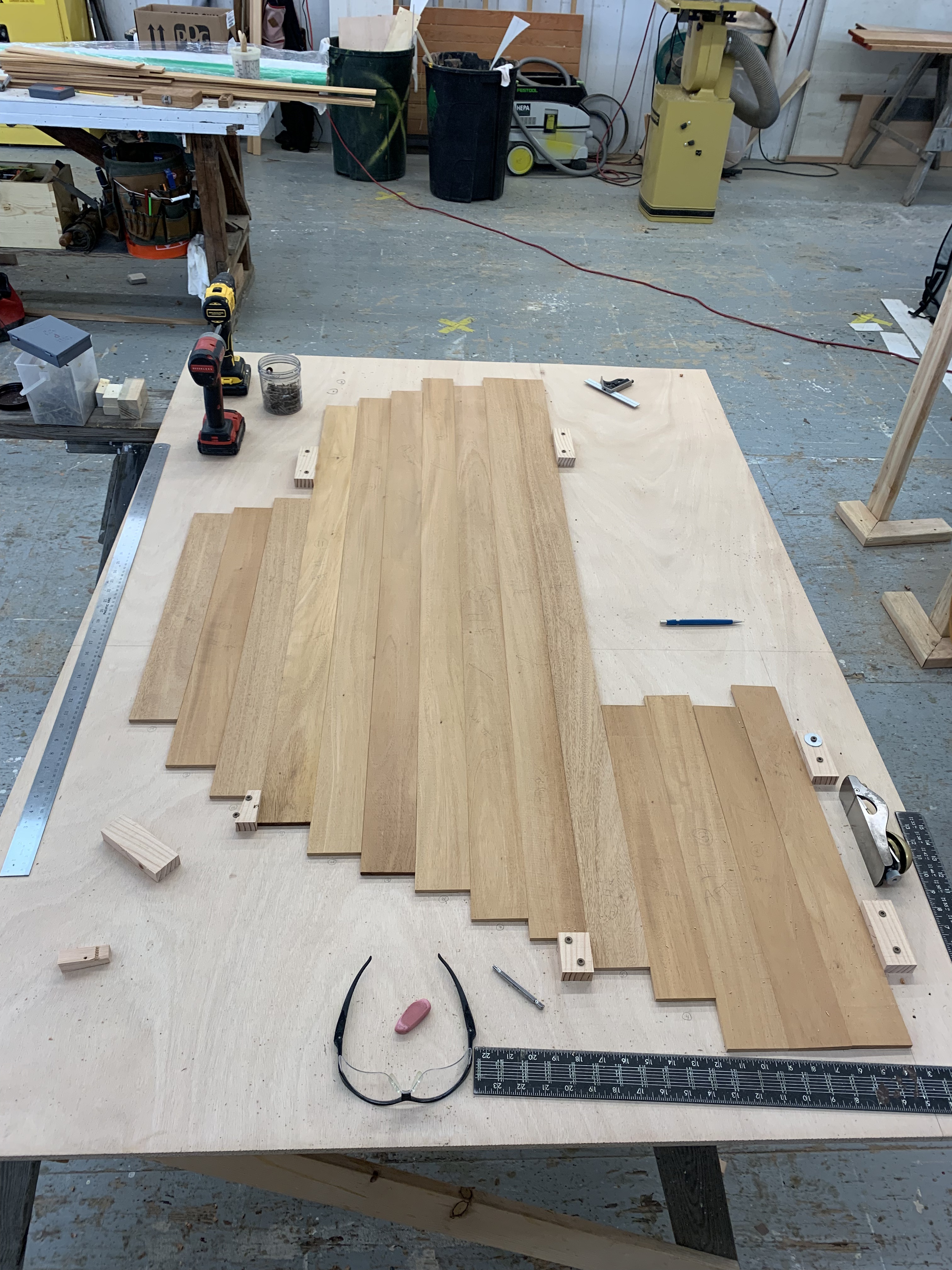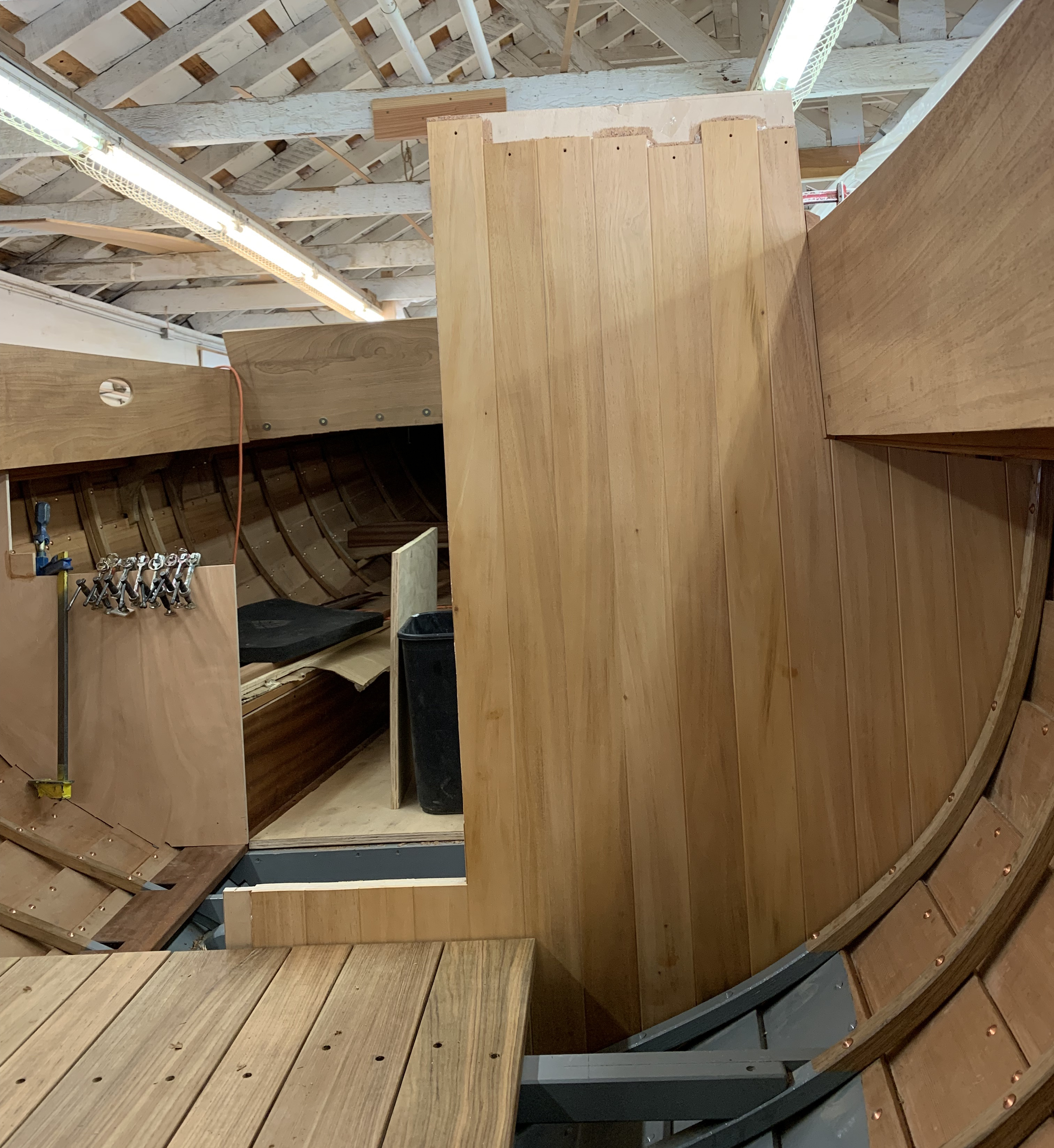 During my boat building course I patterned for and made two faux tongue-and-groove bulkheads for the Folkboat. I used plywood, Honduran mahogany, and the vacuum bag technique. I milled ¼” x 2 ¾” mahogany veneers and laid them out on both sides of the sheets of plywood in their rough finished shape. I laminated the veneers to the plywood substrate using epoxy and a vacuum bag. I repeated this process three more times to create two, double-sided veneered bulkheads. Next I set up a router jig to route shallow v-grooves along the veneer seams to create the tongue-and-groove appearance. Lastly I transferred the patterns to each of the two veneered plywood pieces and cut out their final shape using the jigsaw and bandsaw.