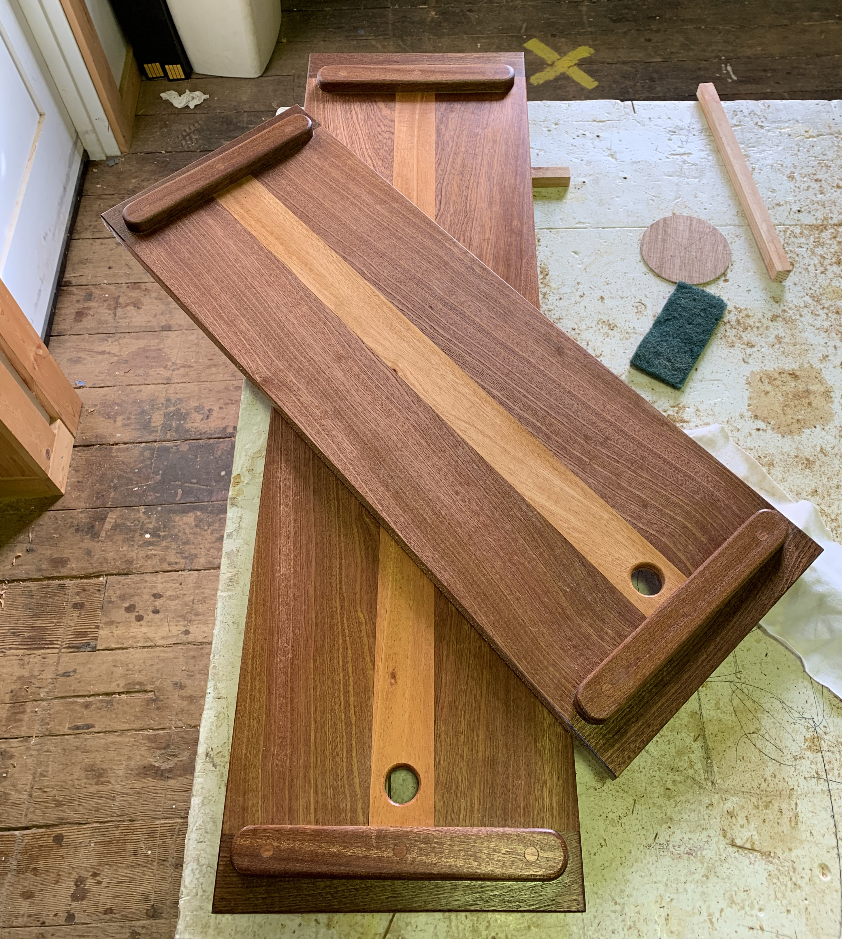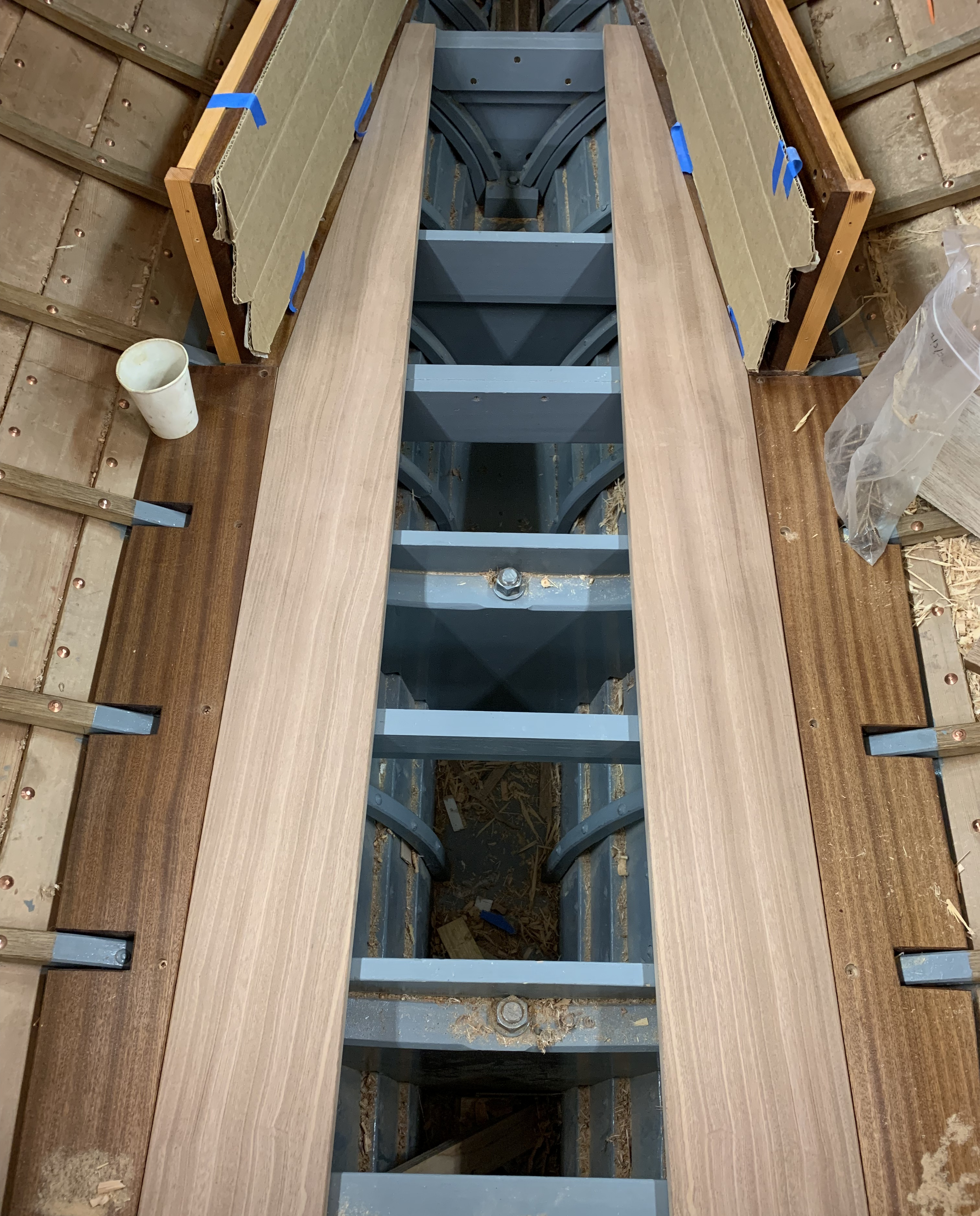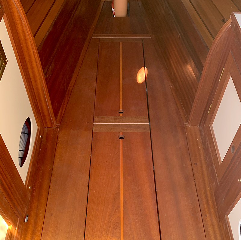 I made and installed the permanent sole boards in the Folkboat’s cabin as well as the removable sole pieces to allow access to the bilge below. I patterned the space using door skin and then determined the optimal shape and size of each piece. I made the removable inserts with book-matched pieces of sapele on either side of a mahogany centerpiece. I fastened cleats on the underside of these pieces to keep them from sliding forward or aft when they are in place.