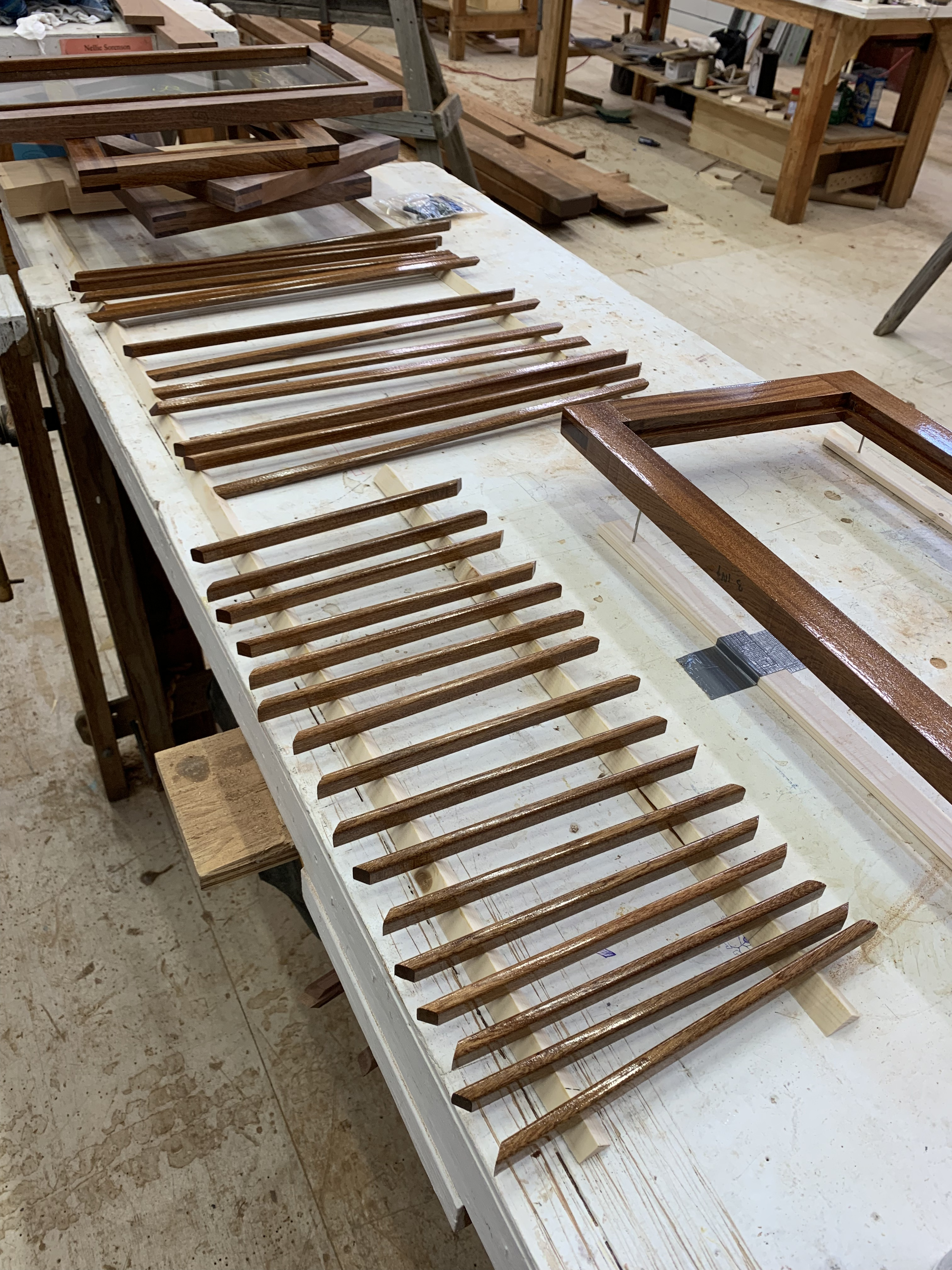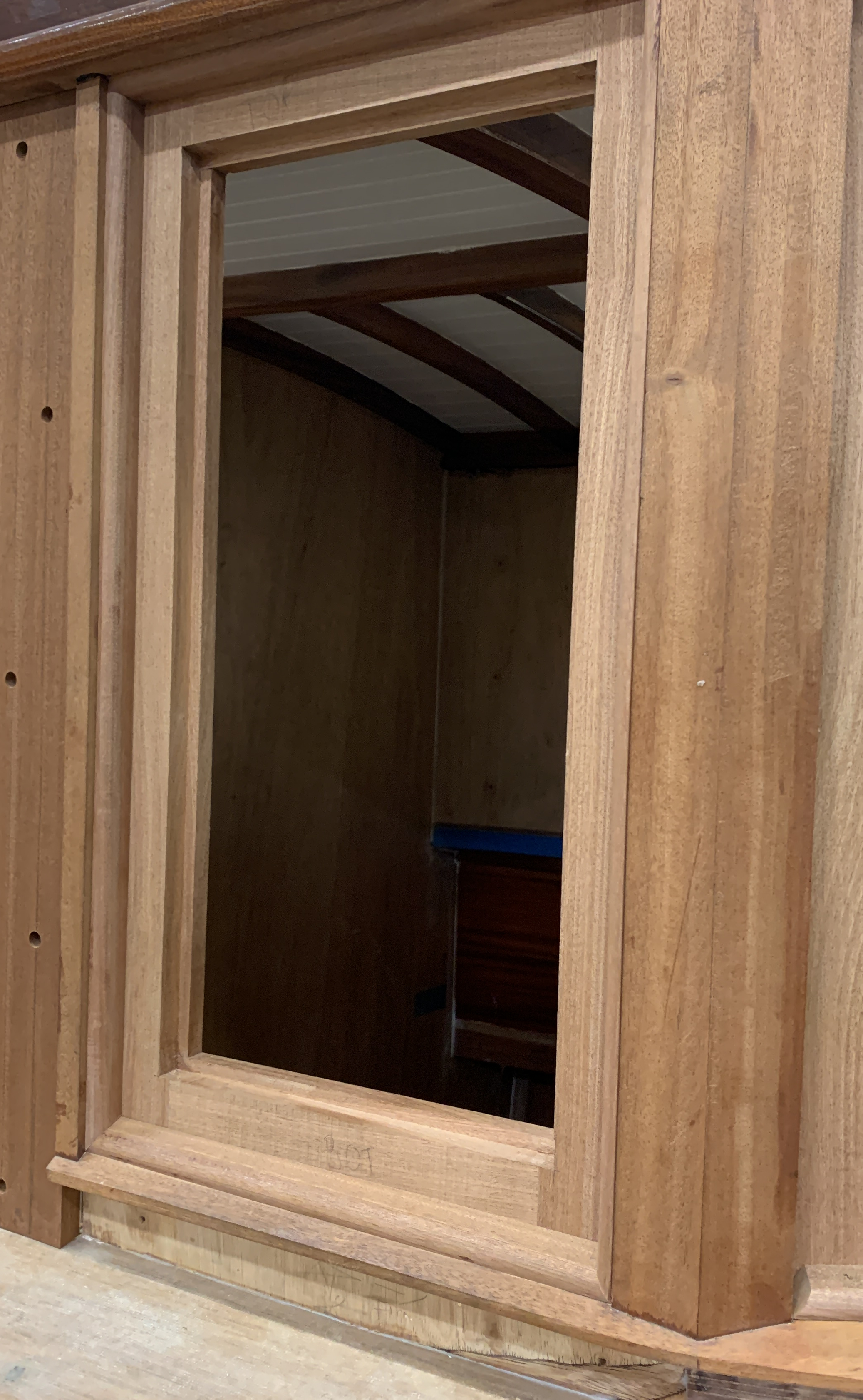I made eight windows for the horseshoe-shaped pilothouse of the 24’ Troller at the NWSWB. Each window was a slightly different quadrilateral shape, most having four different interior angles as well as compound exterior angles. I began by making eight patterns out of door skin and milling the sapele stock to the correct dimensions for the rails and stiles of the window frames. Using my patterns, I cut the stock to length and laid out each of the angled bridle joints. I cut all the joints using a jig on the table saw. After fitting and gluing all of the frames, I routed in the rabbet for the glass and then patterned for each pane. I made eight pieces of compound mitered trim for each window; four to hold the glass in and four to hold the window into the opening on the boat. I installed the glass and inner trim with a flexible adhesive and pin nails. After doing a final fit of each window, I varnished the windows and the exterior trim and installed them.